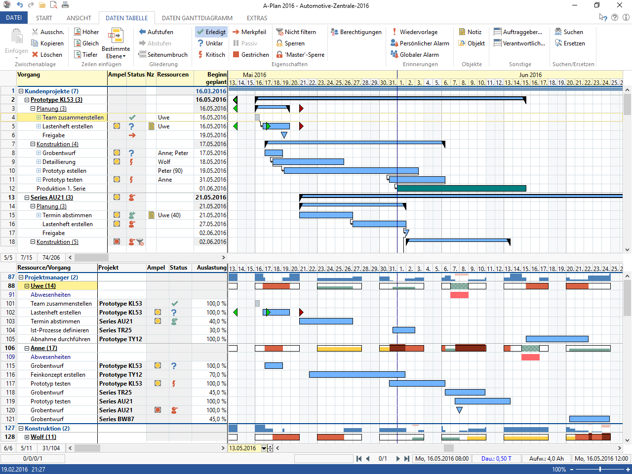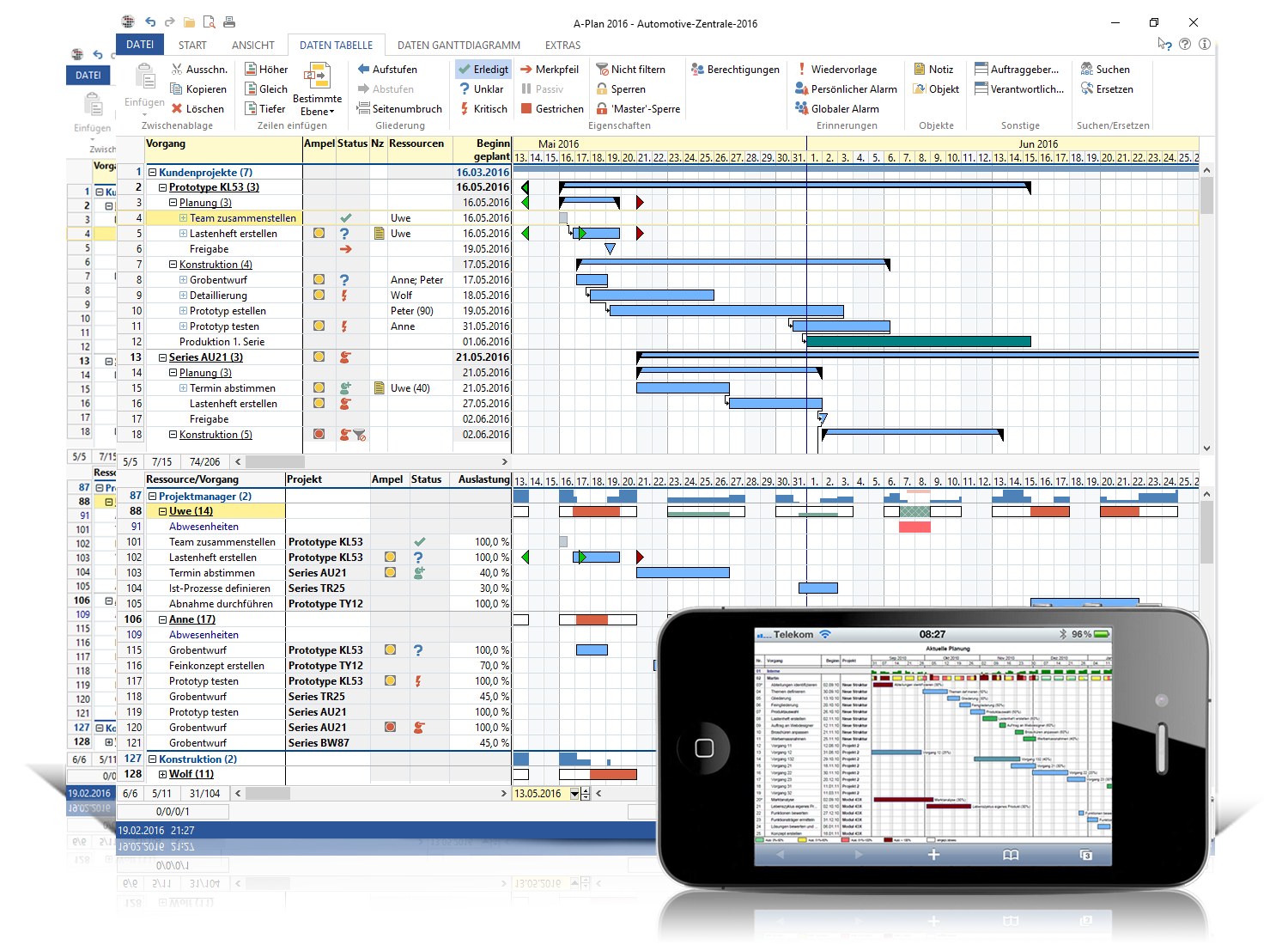 Die Ressourcenplanung ermöglicht es, jedem Vorgang eine oder mehrere Ressourcen wie Personal, Geräte oder Maschinen zuzuordnen. Die Ressourcenansicht ermöglicht zudem eine direkte Aktualisierung von Daten, eine individuelle, farbliche Gestaltung der einzelnen Ressourcen und die Anzeige der Auslastung pro Ressource und der Restkapazität pro Ressourcengruppe an.