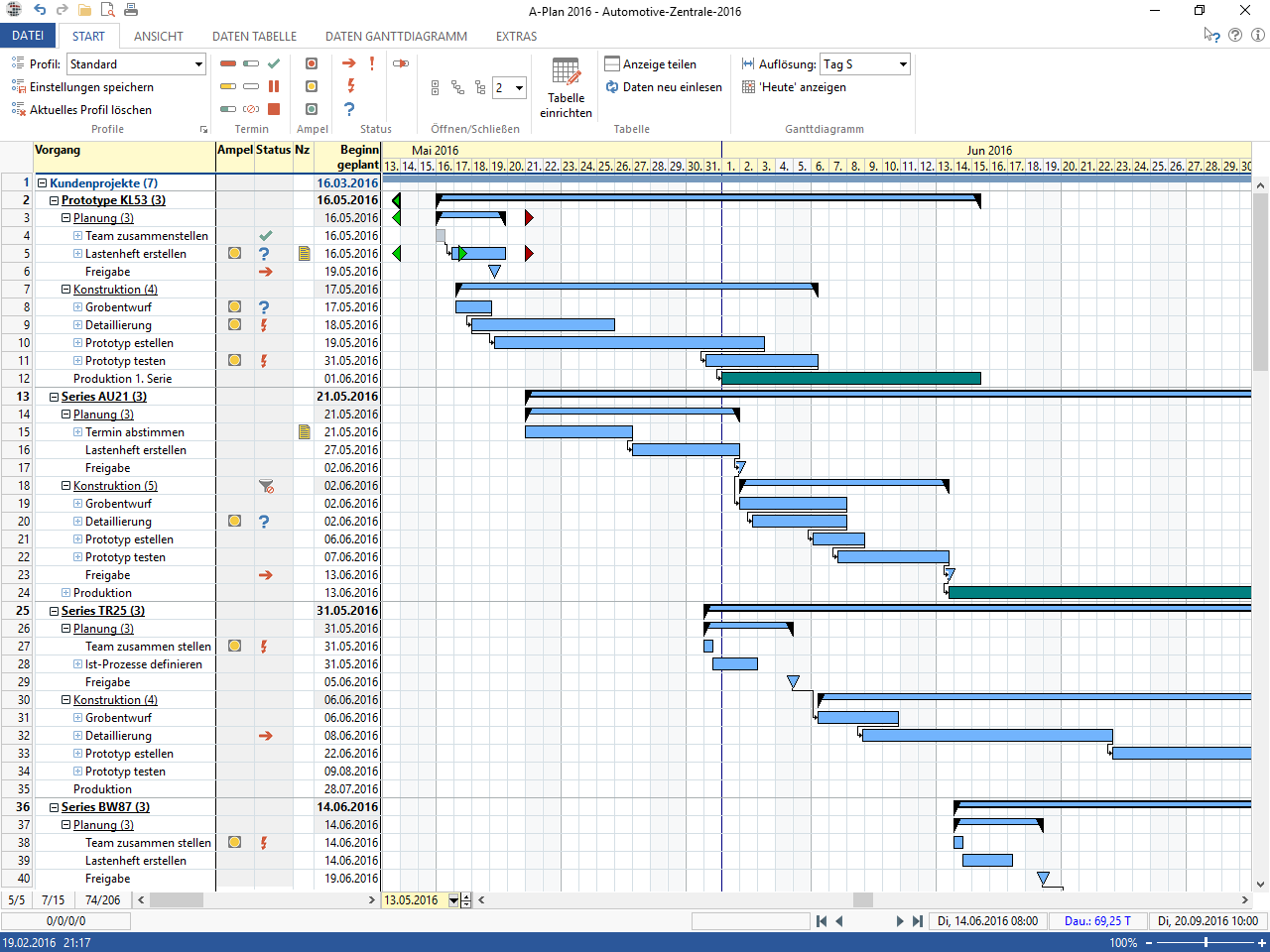 In der Gantt-Diagramm-Ansicht werden die Vorgänge und Meilensteine übersichtlich dargestellt. Dabei werden jedoch auch noch weitere wichtige Informationen mit angezeigt, wie Abhängigkeiten zwischen Vorgängen oder zusammengefasste Vorgänge. Rund um Gantt-Diagramm und Zeitbalken gibt es noch viele weitere Ansichtseinstellungen wie zum Beispiel die Vorgangsbezeichnung neben dem Zeitbalken, die Darstellung des kritischen Pfads oder die Ressourcen-Auslastung.